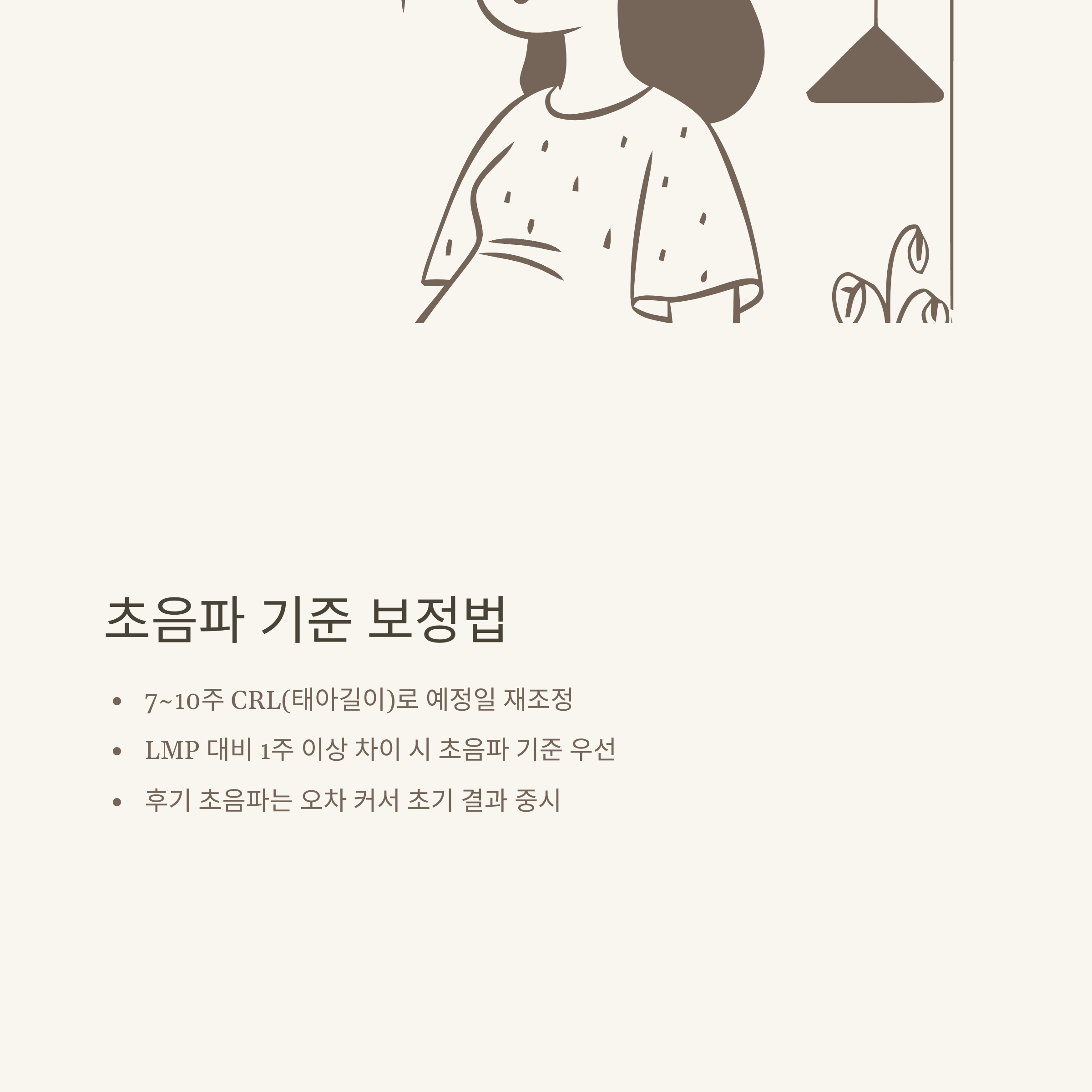 병원에서는 마지막 생리일 기준으로 계산한 예정일과 실제 태아의 성장 상태를 비교해서, 필요에 따라 초음파 측정값으로 예정일을 다시 정하는 경우가 많아요. 저도 임신 8주차에 첫 정밀초음파를 했는데, 실제 성장 속도가 표준 곡선과 살짝 달라 초음파 기준 예정일로 소폭 조정된 경험이 있습니다.