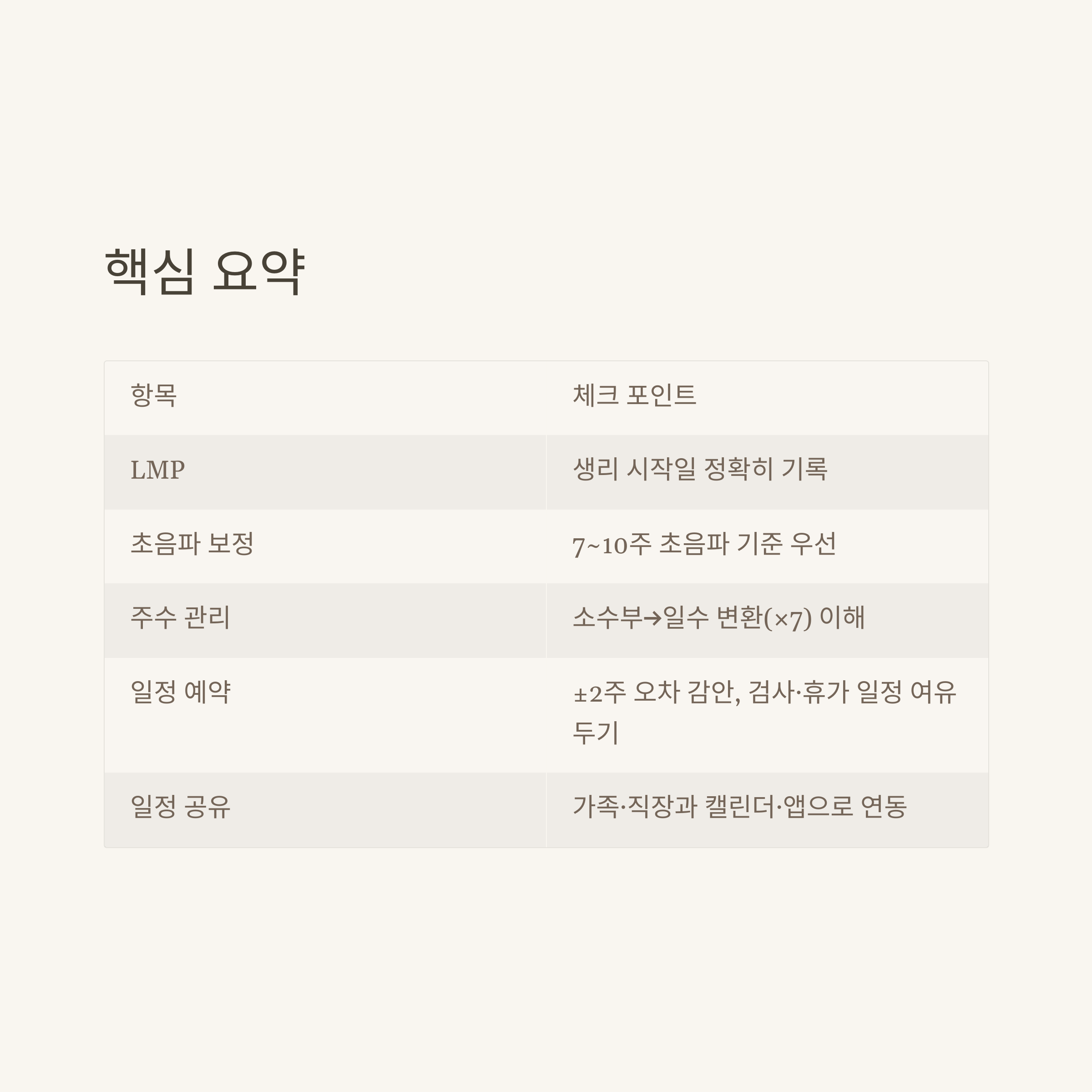 실제로 저는 임신 주수에 맞춰 구글 캘린더와 메모앱에 “몇 주차 무슨 검사”, “산모 교실”, “출산용품 준비” 등을 세분화해서 입력해뒀어요. 계산기로 산출된 예정일을 기준 삼아 각종 예약과 준비 일정을 쪼개 관리하니 훨씬 덜 불안했습니다.