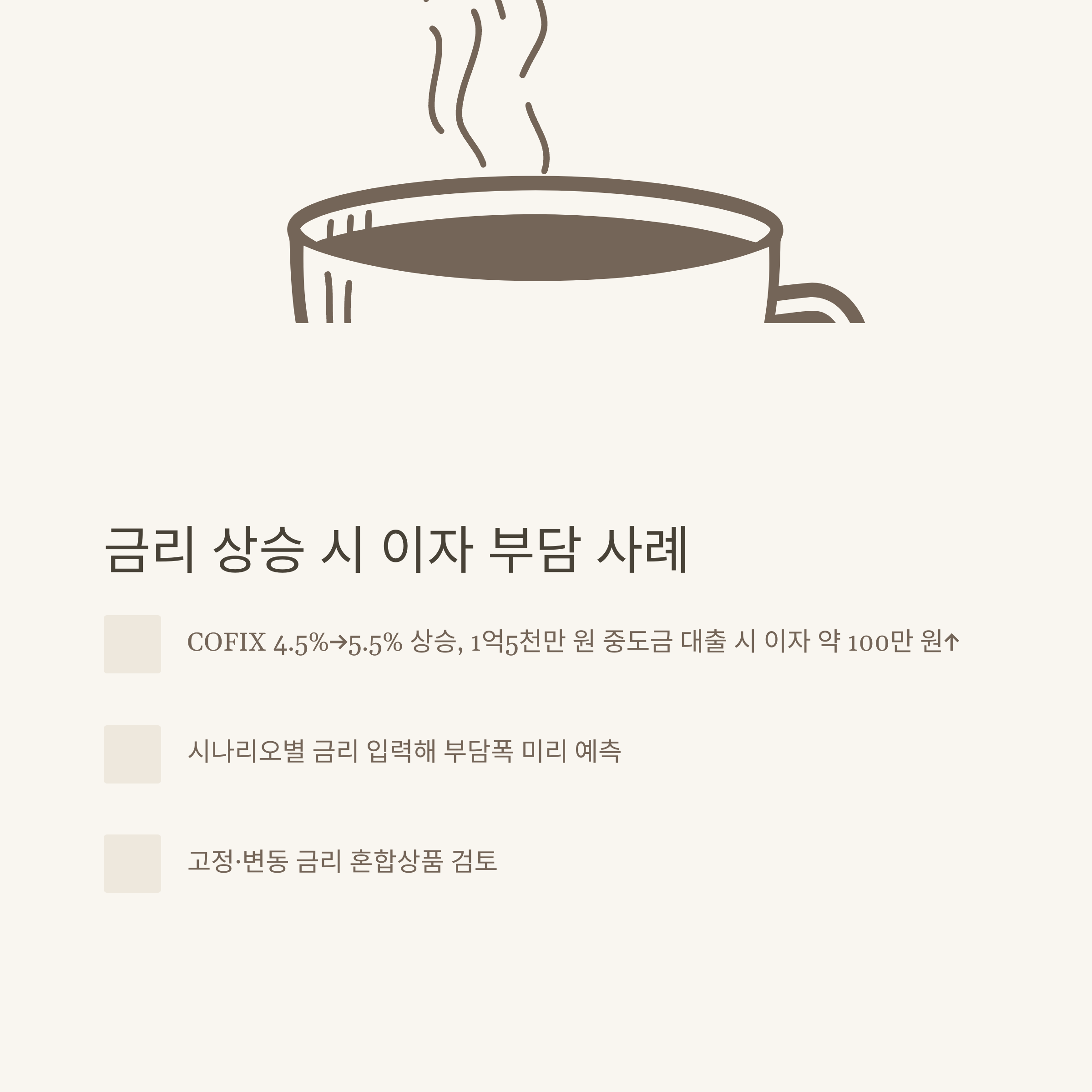 - 금리 1% 상승 시 전체 이자 부담이 수십만~수백만 원 추가