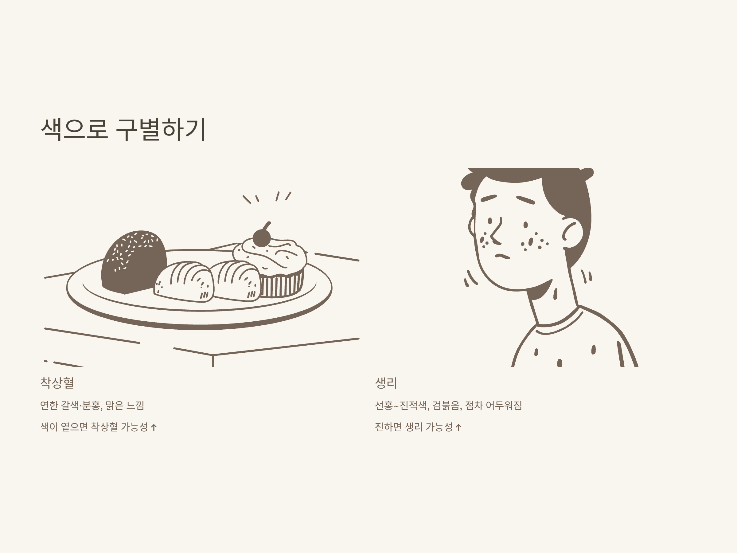 A. 색이 진한 적색이면 대부분 생리, 연한 갈색·분홍이면 착상혈일 확률이 높습니다.