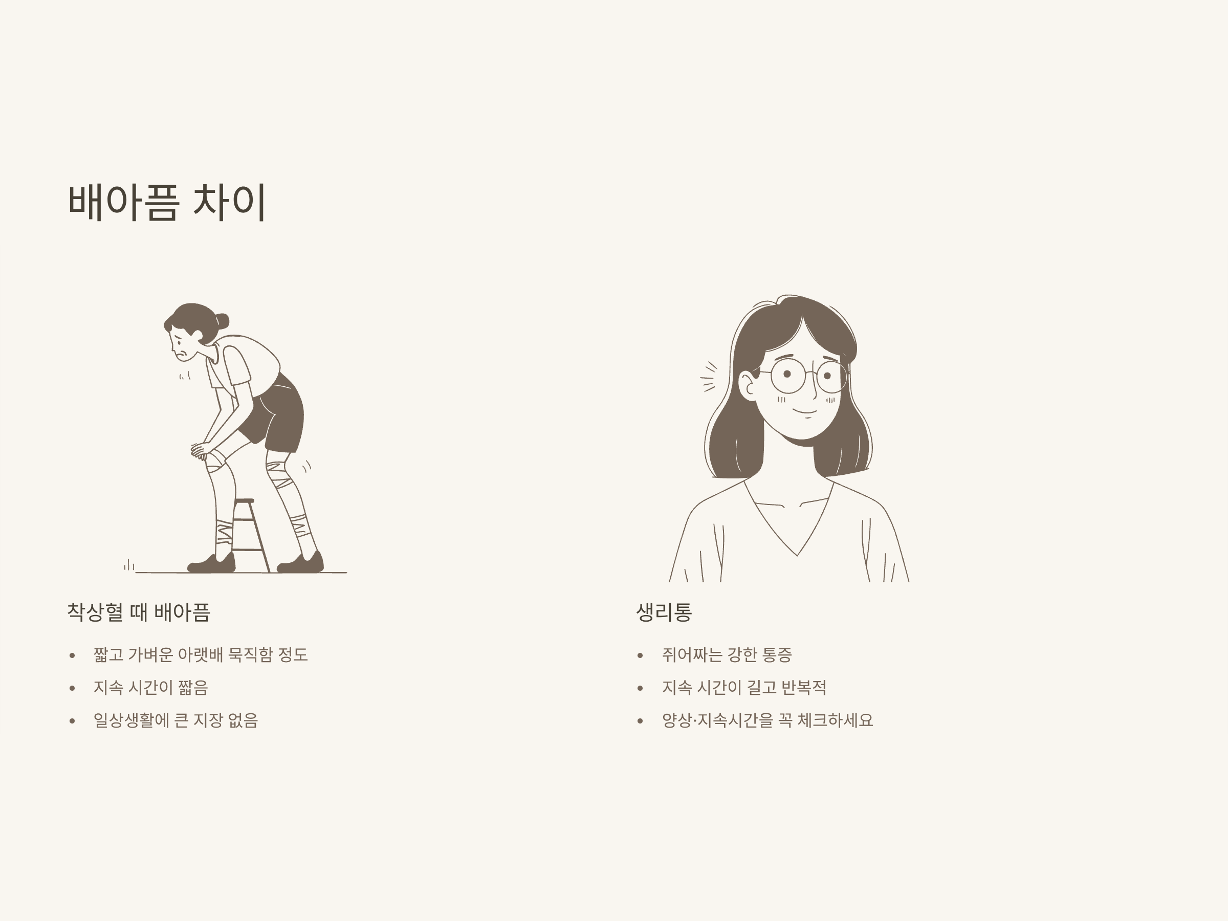 - 생리: 쥐어짜는 통증, 장기간 반복, 활동 지장