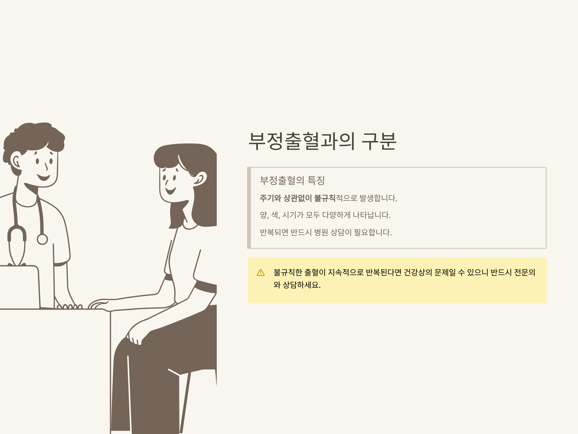 부정출혈은 생리와 관계없는 시기에 양이 적거나, 점상 출혈이 나타나기도 합니다. 색은 주로 연한 갈색이나 분홍색, 때론 검붉게 보이기도 하죠. 서울대병원 자료(공식자료 보기)에 따르면, 착상혈은 일회성·소량·통증 거의 없음, 생리는 규칙적·양 많음·통증 동반, 부정출혈은 불규칙·양/색/시기 모두 다양이라는 특징이 있습니다.