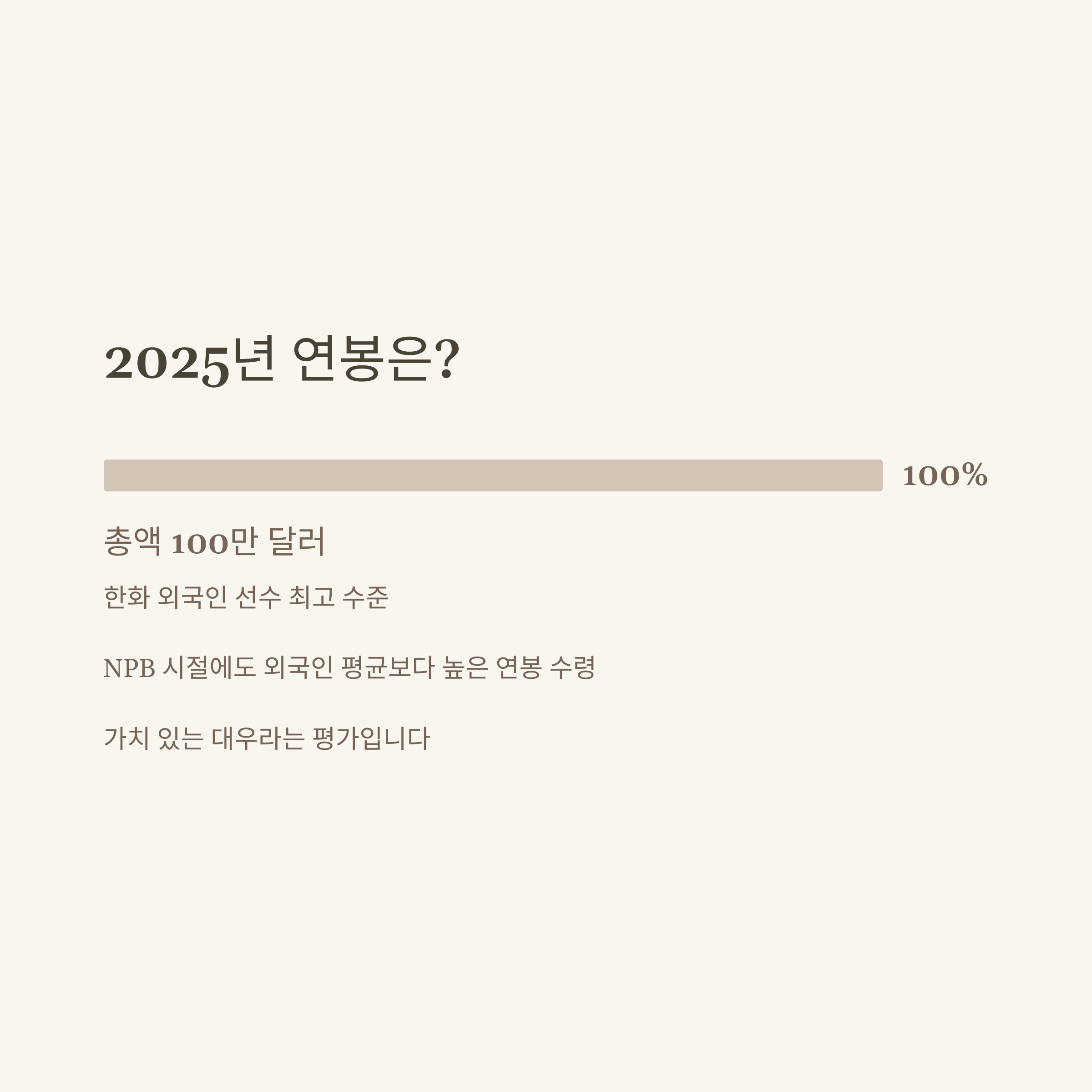 A. 한화 이글스와 1년 총액 100만 달러(계약금 20만 달러+연봉 80만 달러)에 계약했습니다.