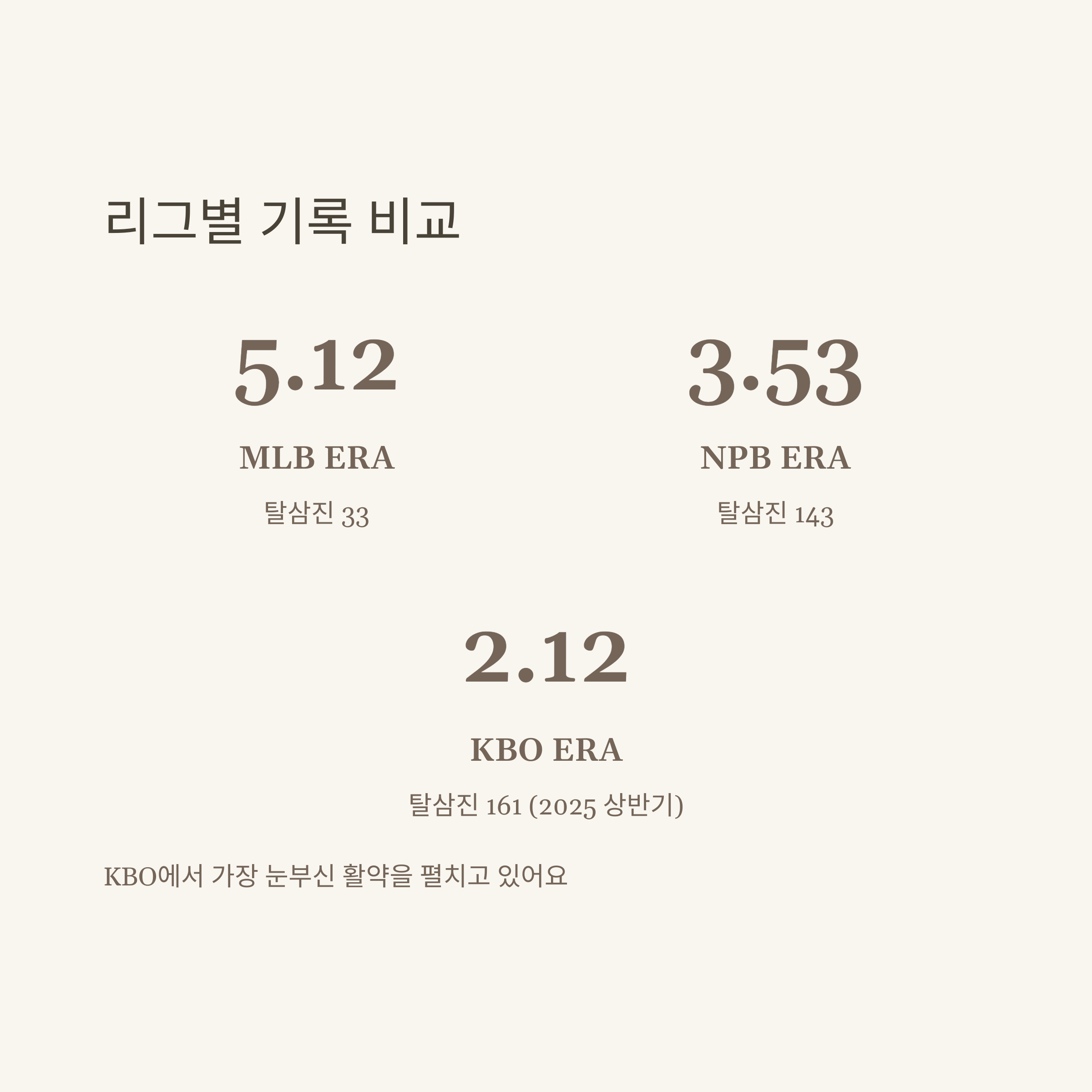 MLB에서는 평균 구속이 리그 평균과 비슷하거나 약간 높은 정도였지만, 일본과 한국을 거치며 갑자기 구속이 오르고 피칭 스타일이 훨씬 완성된 느낌입니다. MLB 시절 평가로는 ‘이닝을 길게 가져가긴 어렵지만, 삼진 능력과 구종 다양성은 확실하다’는 평이 많았고, 실제로 2025년 현재 KBO에서 그 장점이 완전히 터진 모습이죠.