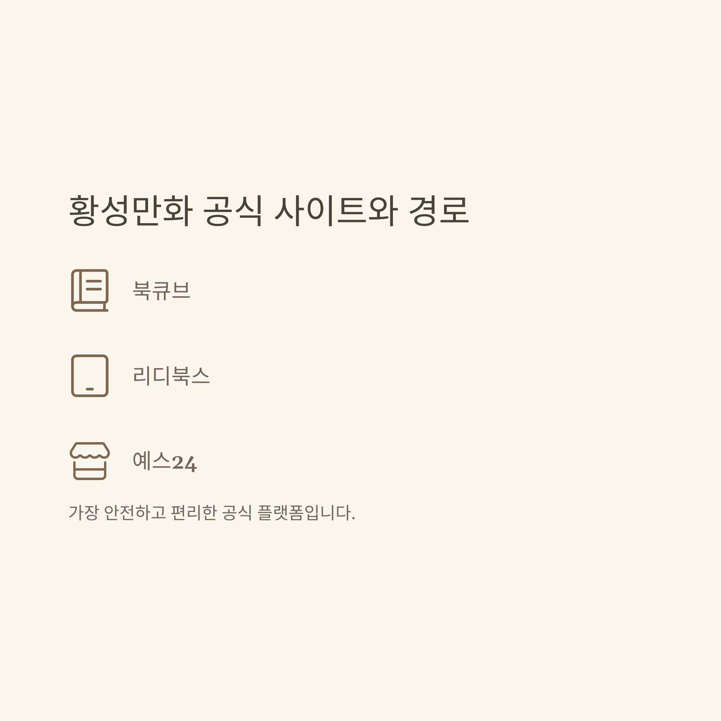 최근에는 다양한 공식 플랫폼에서 황성만화를 무료 이벤트나 첫 권 무료, 혹은 일부 연재분 무료로 서비스하고 있어, 누구나 쉽게 황성 작가의 대표 작품을 체험할 수 있습니다. 실제로 무료 이벤트로 접한 후 유료로 정주행하게 되는 경우가 많았고, 황성만화의 매력을 가장 부담 없이 즐길 수 있는 방법이기도 합니다.