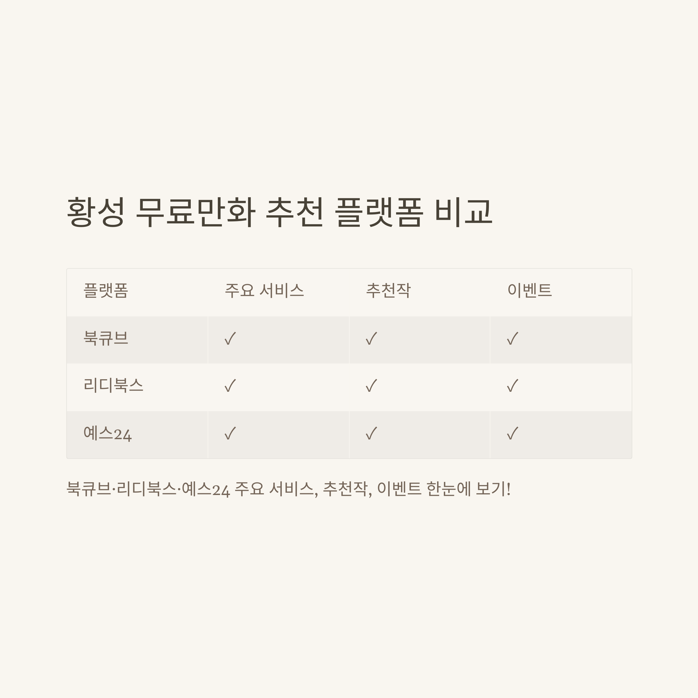 | 북큐브 | 황성 무료만화관, 무협 특화 | 비뢰도, 천년호 | 정기적 무료관, 이벤트 | 첫 권 무료, 모바일앱 지원 |