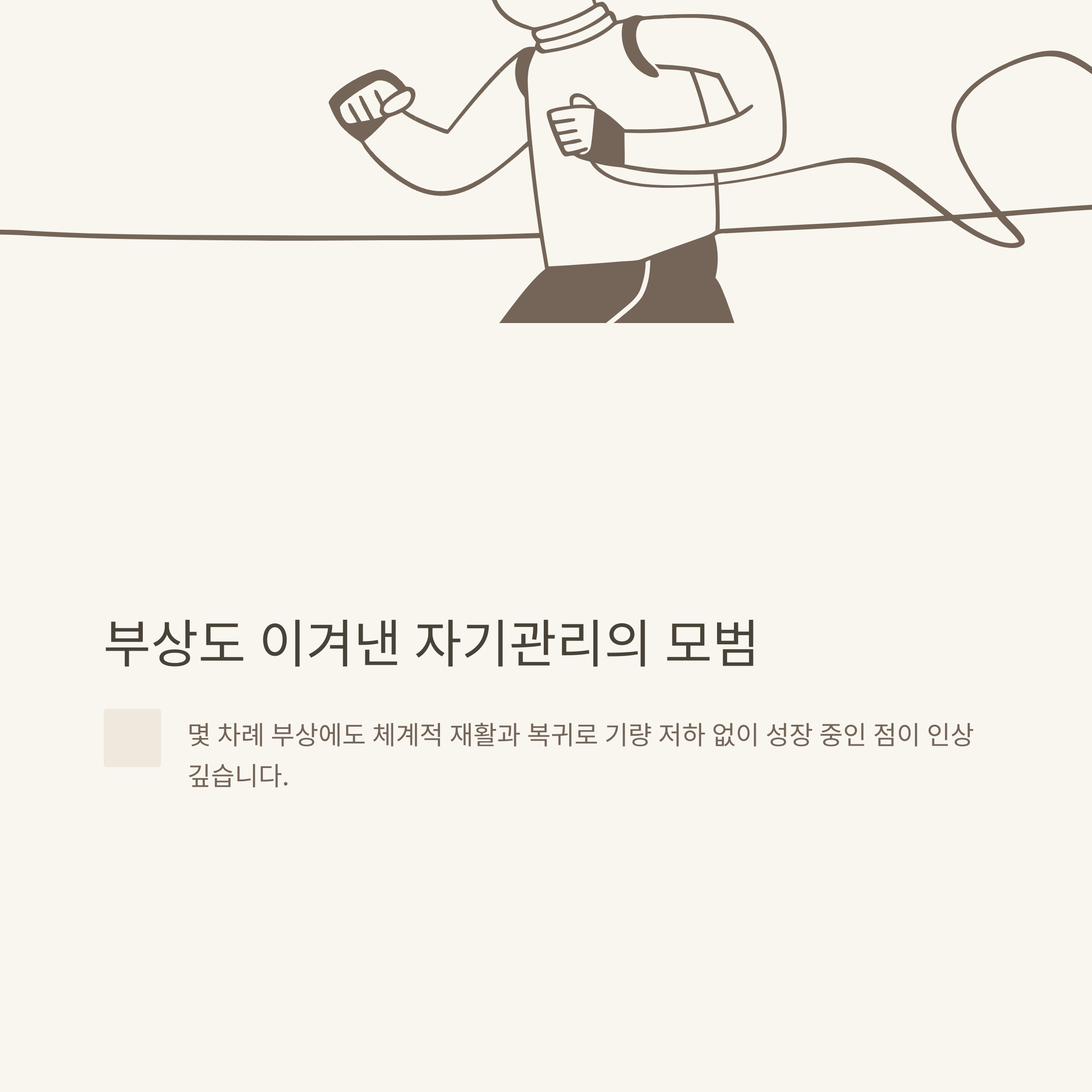 선수 생활 중 부상은 피할 수 없는 부분입니다. 황준서 역시 데뷔 후 몇 차례 부상을 겪었지만, 꾸준한 재활과 철저한 자기관리를 통해 빠르게 복귀했습니다. 저는 재활 과정에서 선수 본인의 의지가 얼마나 중요한지 현장에서 많이 느꼈습니다.
