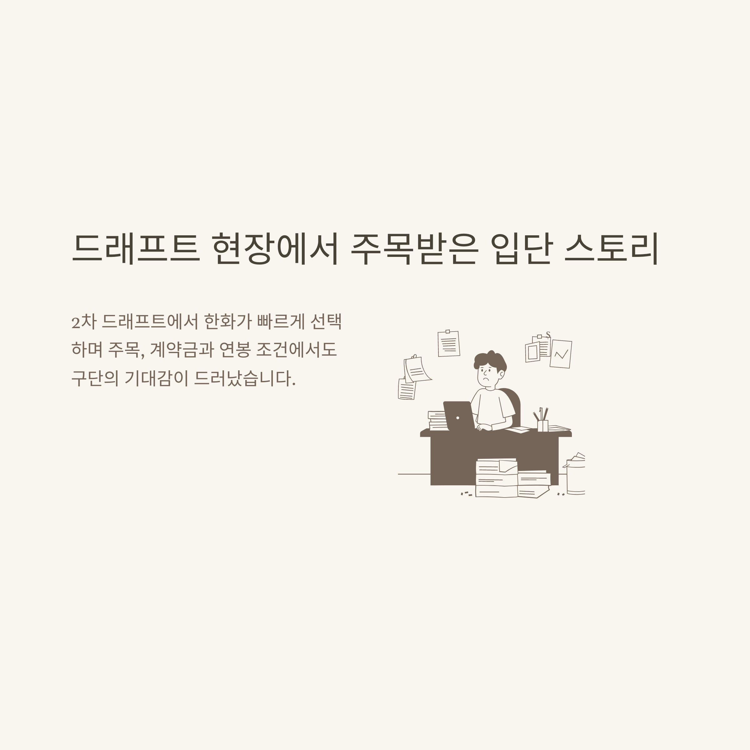한화 이글스 입단 과정에는 드라마 같은 뒷이야기도 많았습니다. 실제로 2차 신인드래프트에서 비교적 이른 순번으로 선택됐는데, 당시 현장에서도 “이 선수 한화가 데려간다!”라는 소리가 나왔던 걸로 기억합니다.