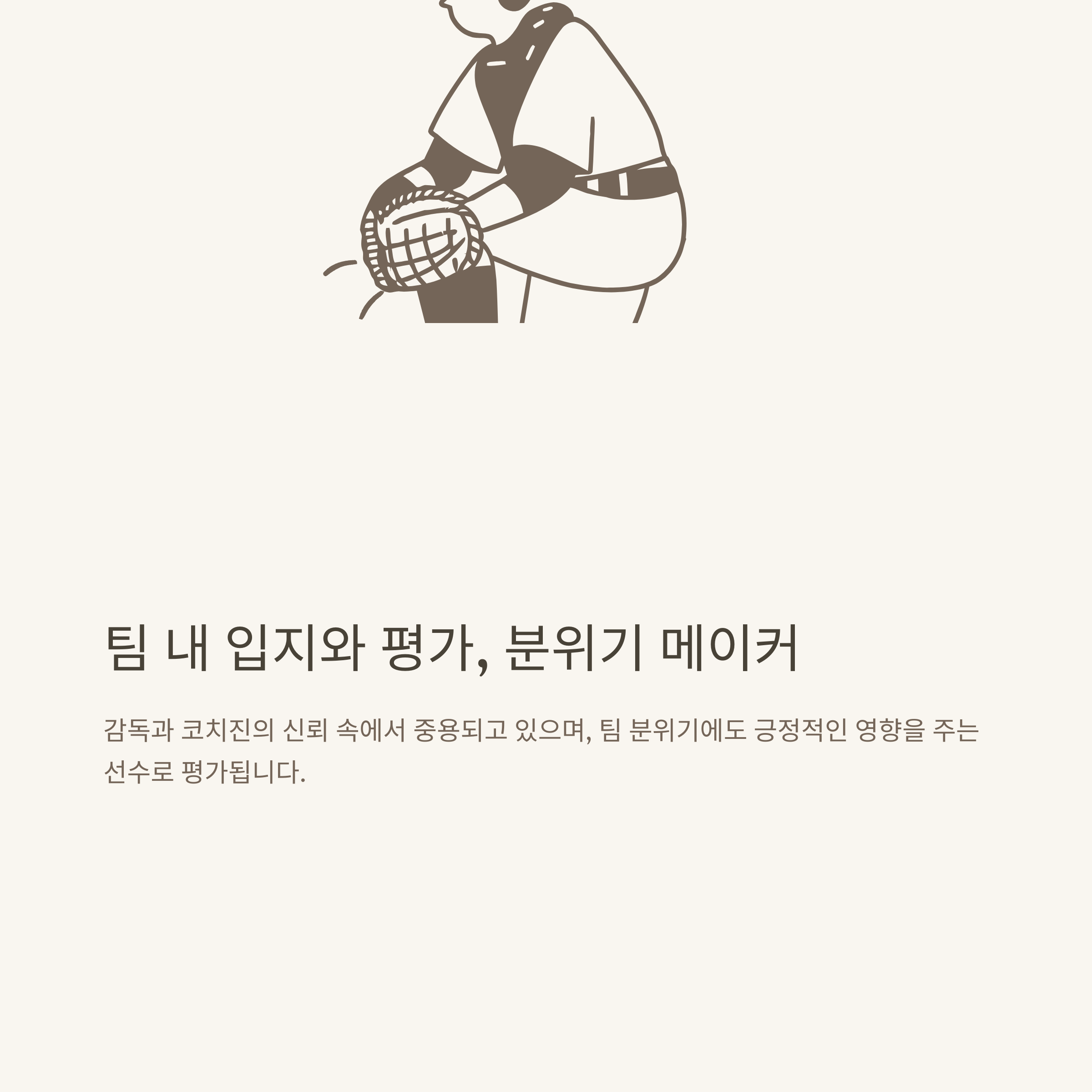 팀 내에서는 성실함과 긍정적인 태도로도 좋은 평가를 받고 있습니다. 특히 젊은 선수로서 팀 분위기에도 활력을 불어넣는 역할을 하고 있고, 팬들 사이에서도 “앞으로가 더욱 기대되는 선수”라는 평가가 많습니다.