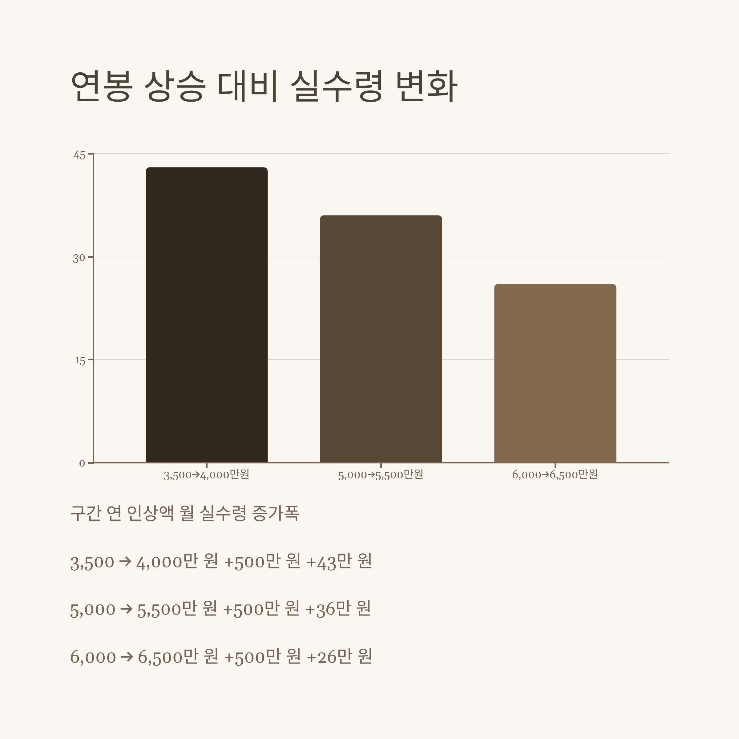 연봉이 올라가면 실수령액도 증가하지만, 그 비율은 연봉 구간에 따라 확연히 달라집니다. 특히 4,600만 원을 기준으로 소득세율 구간이 바뀌면서, 실수령 증가폭은 줄어들게 돼요. 예를 들어 연봉이 4,000에서 4,500으로 오르면 실수령은 약 40만 원 증가하는 반면, 6,000에서 6,500으로 오르면 25만 원 내외로 줄어듭니다.