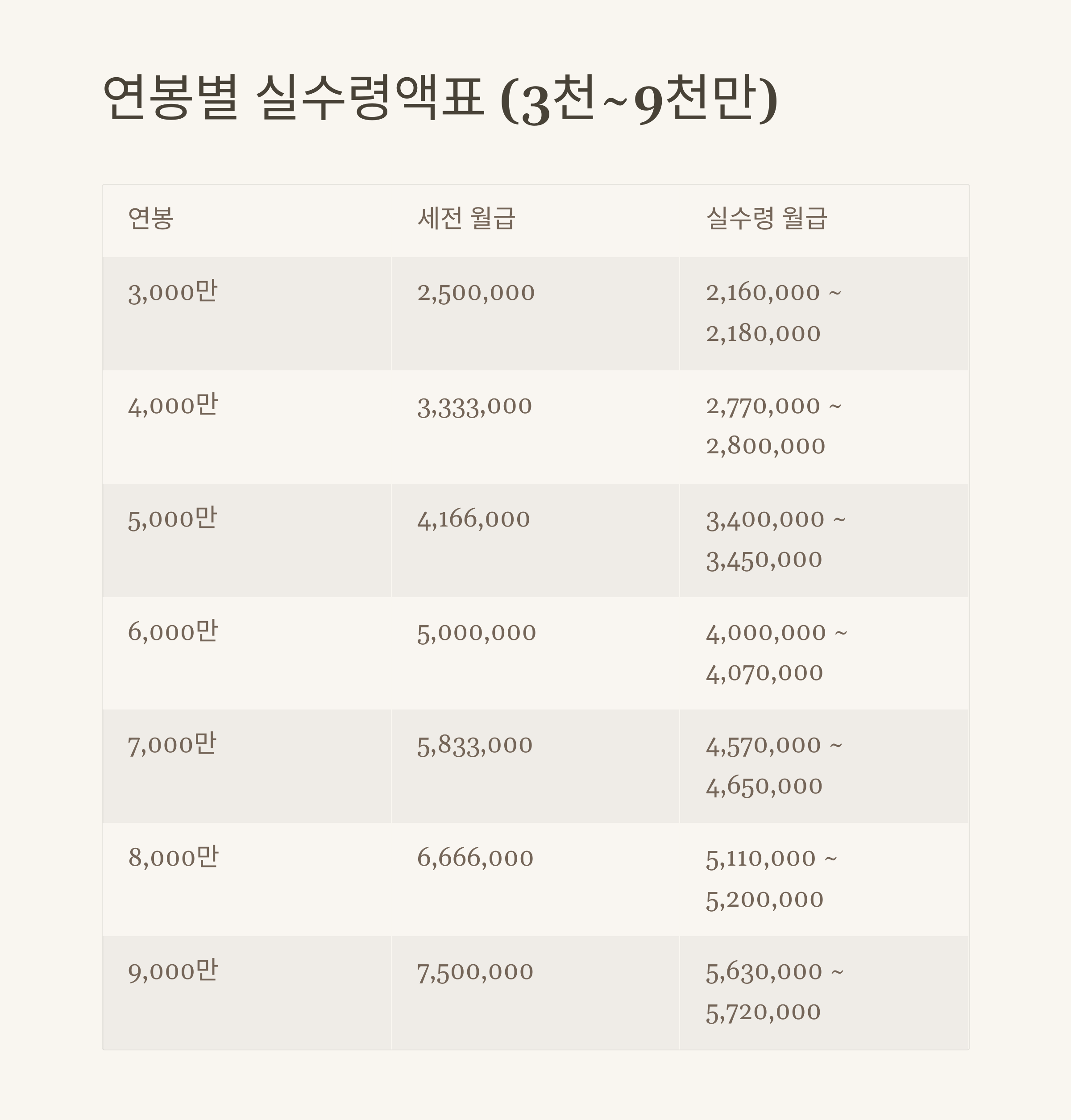 연봉 실수령액표는 단순 참고용이지만, 실제로 이직 제안이나 연봉 협상 시 ‘가장 빠르게 비교할 수 있는 기준’입니다. 특히 3,000만 원부터 9,000만 원까지는 세금 구간이 뚜렷하게 달라지기 때문에, 세후 월급 차이를 꼭 체크해봐야 합니다. 아래 표는 2025년 4대 보험 및 세금율 기준으로 정리한 예시입니다. 1인 가구, 비과세 수당 제외 기준입니다.