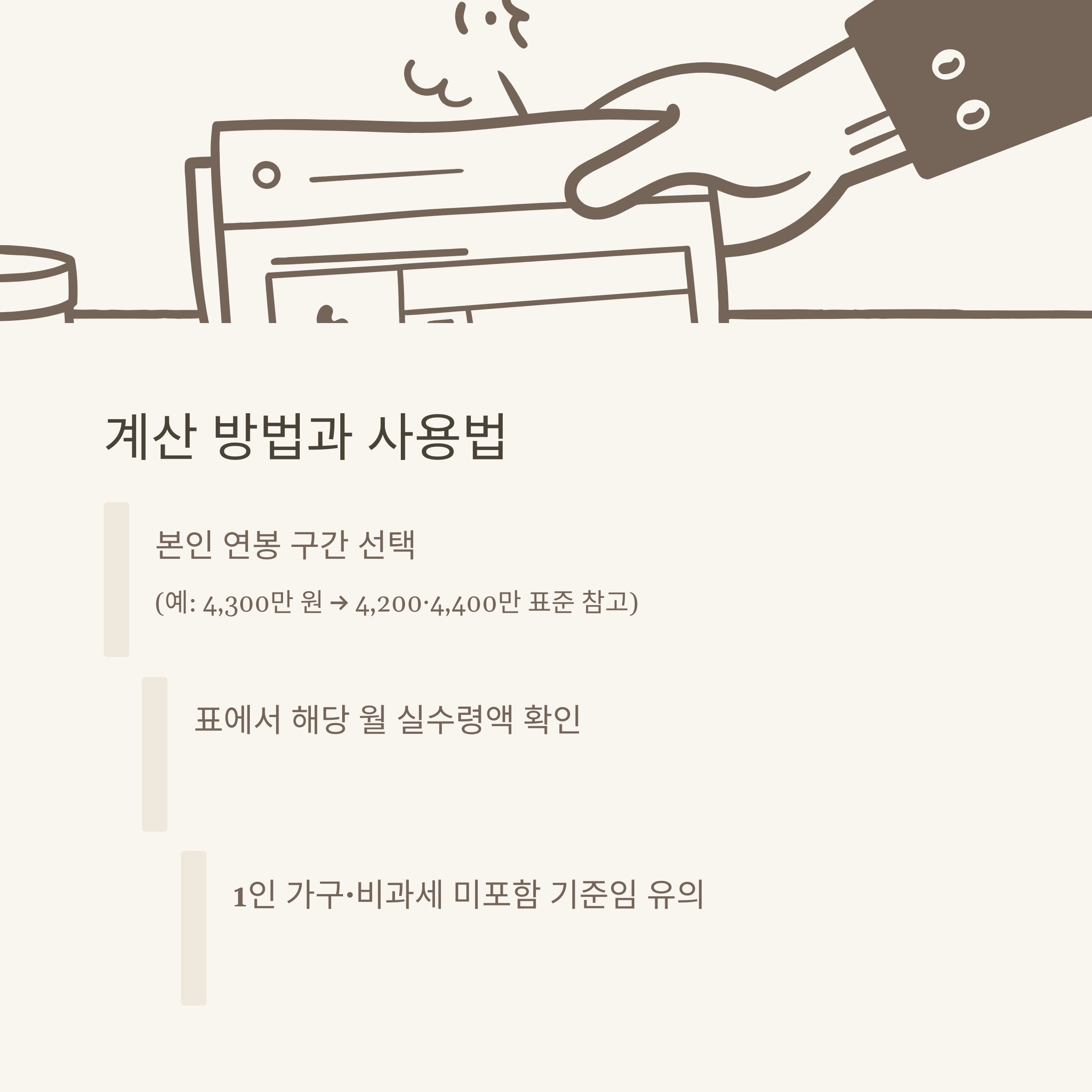 - 표는 기본적으로 1인 가구 기준이며, 부양가족이 있을 경우 실수령액이 달라질 수 있음