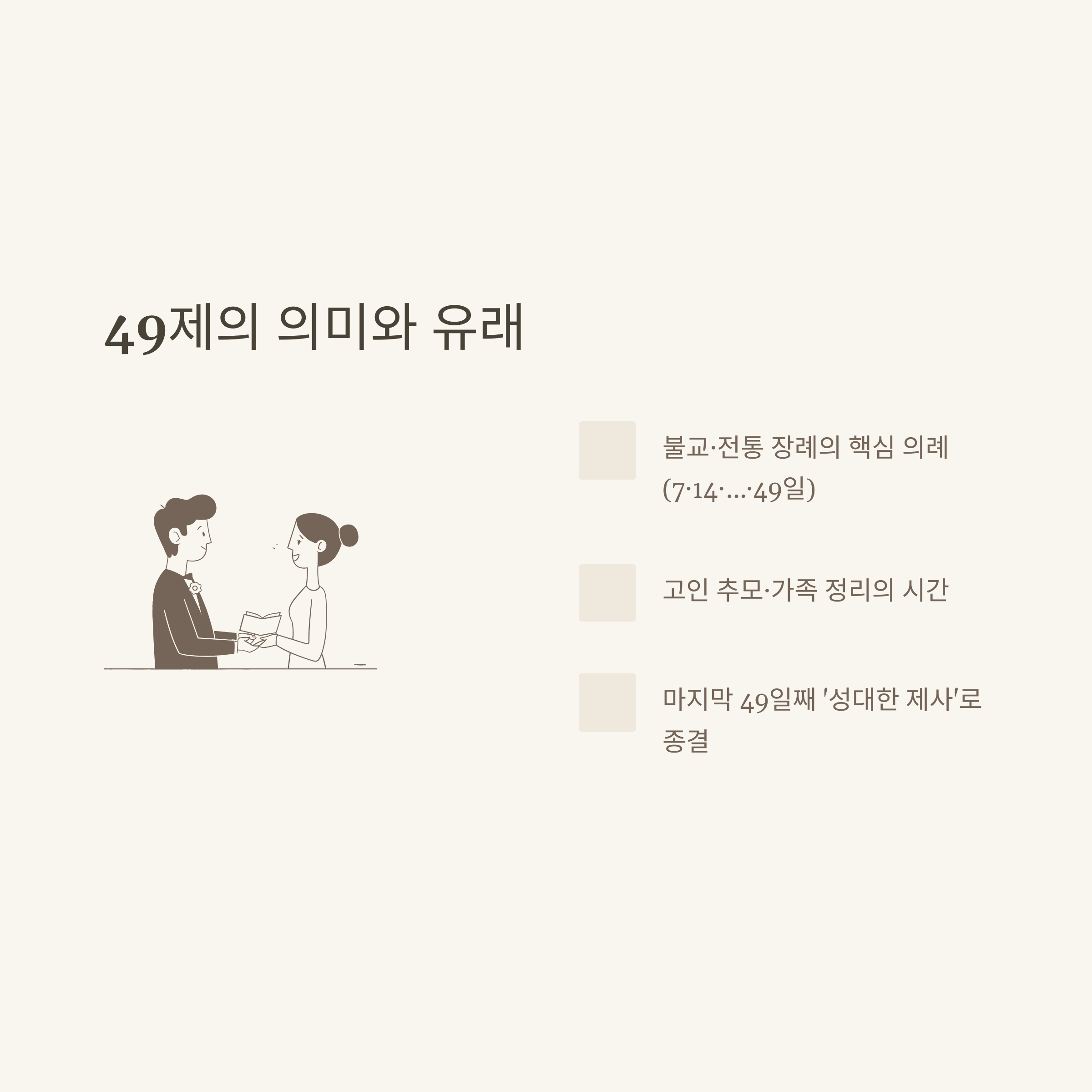 제가 49제를 지냈을 때도 49일을 준비하다 보니 돌아가신 분을 곱씹으며 추억할 기회가 많았고, 가족 간의 유대도 더 깊어지는 경험을 했습니다. 그래서 날짜 맞추는 것뿐 아니라 마음의 준비를 할 수 있는 기간으로서의 의미도 크다고 생각해요.