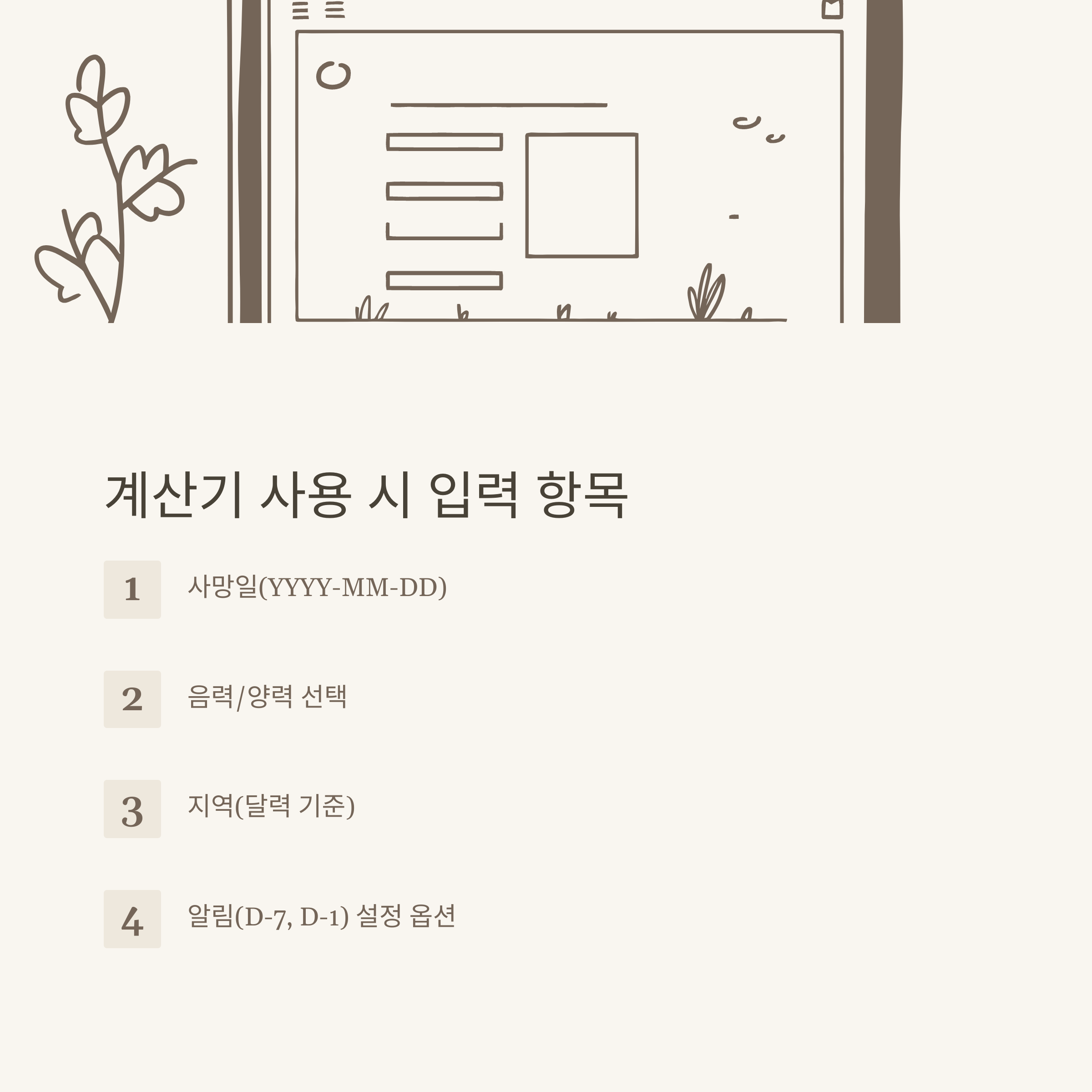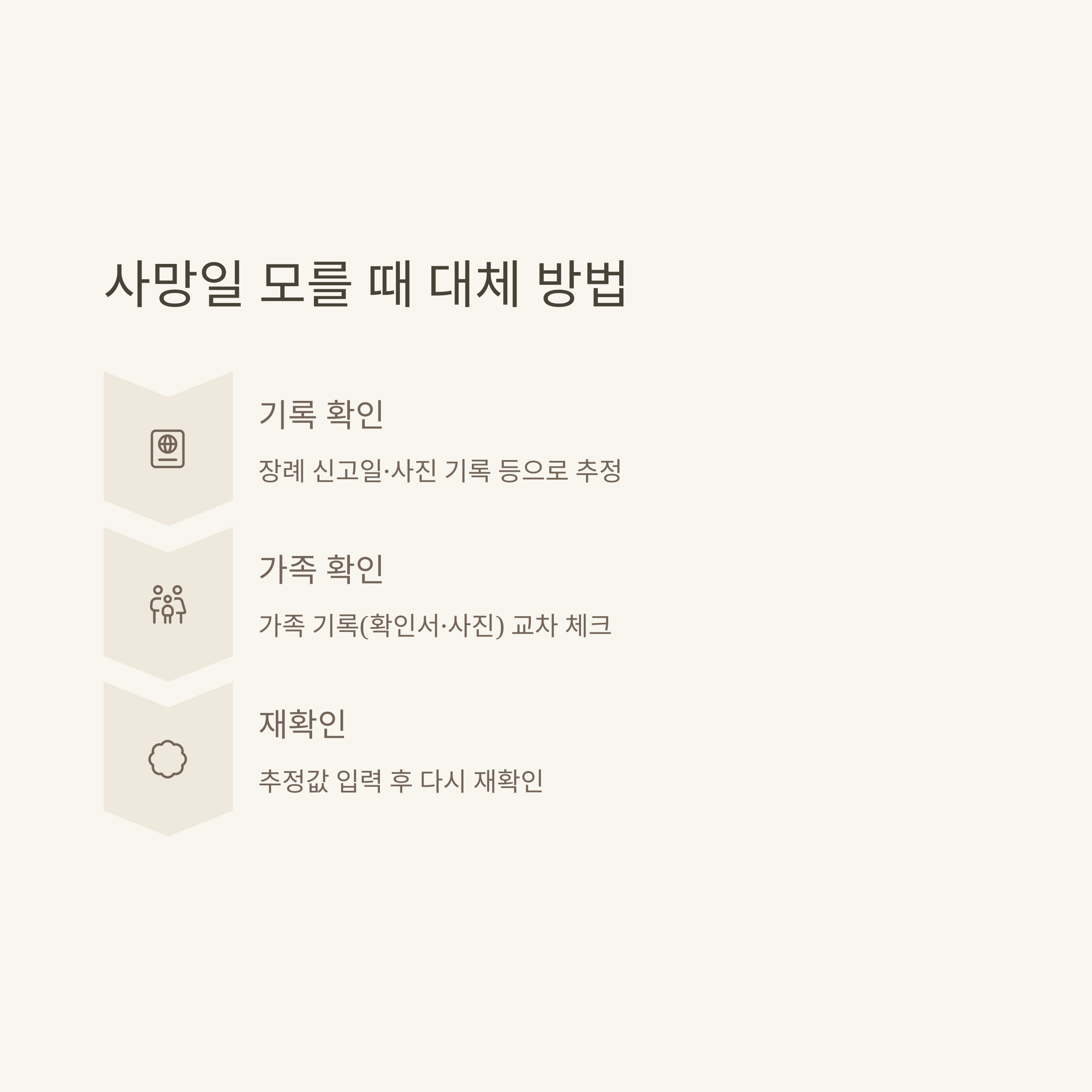 간혹 사망일이 정확히 기록되지 않은 경우도 있습니다. 저도 조부모님 작업일 기록만 있어 날짜를 정확히 몰랐어요. 이 경우에는 가장 가까운 날짜로 추정해서 계산기 입력 후, 유족들과 교차 확인하시는 게 좋습니다.