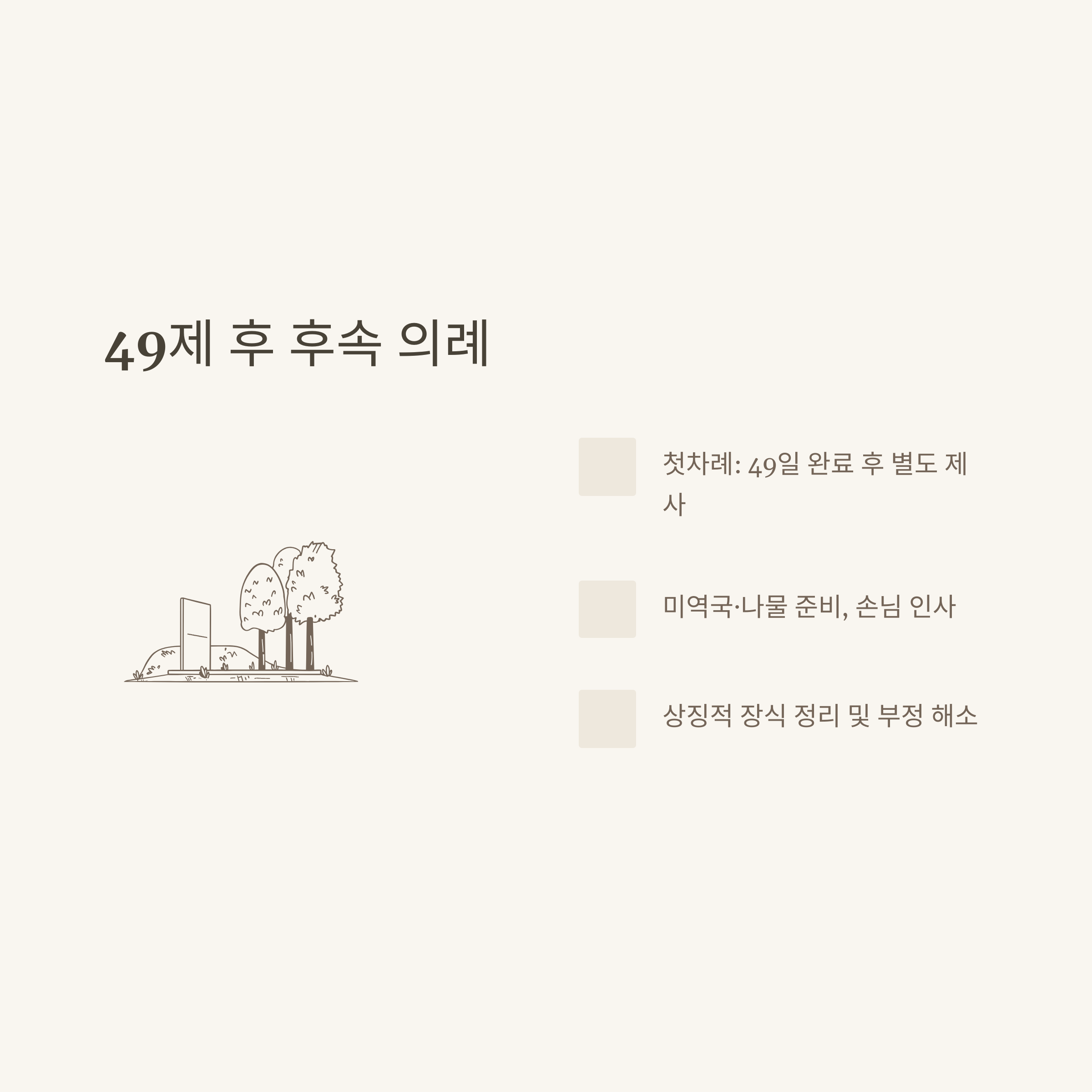49제가 끝나면 ‘부정(不淨)’이 풀린다고 해서 성대한 제사를 많이 지내는데, 이 시기에도 다양한 전통 풍습이 이어집니다. 저는 49제 이후에 ‘첫차례’를 올리고 가족이 모여 나물과 탕을 나눈 경험이 있었어요.