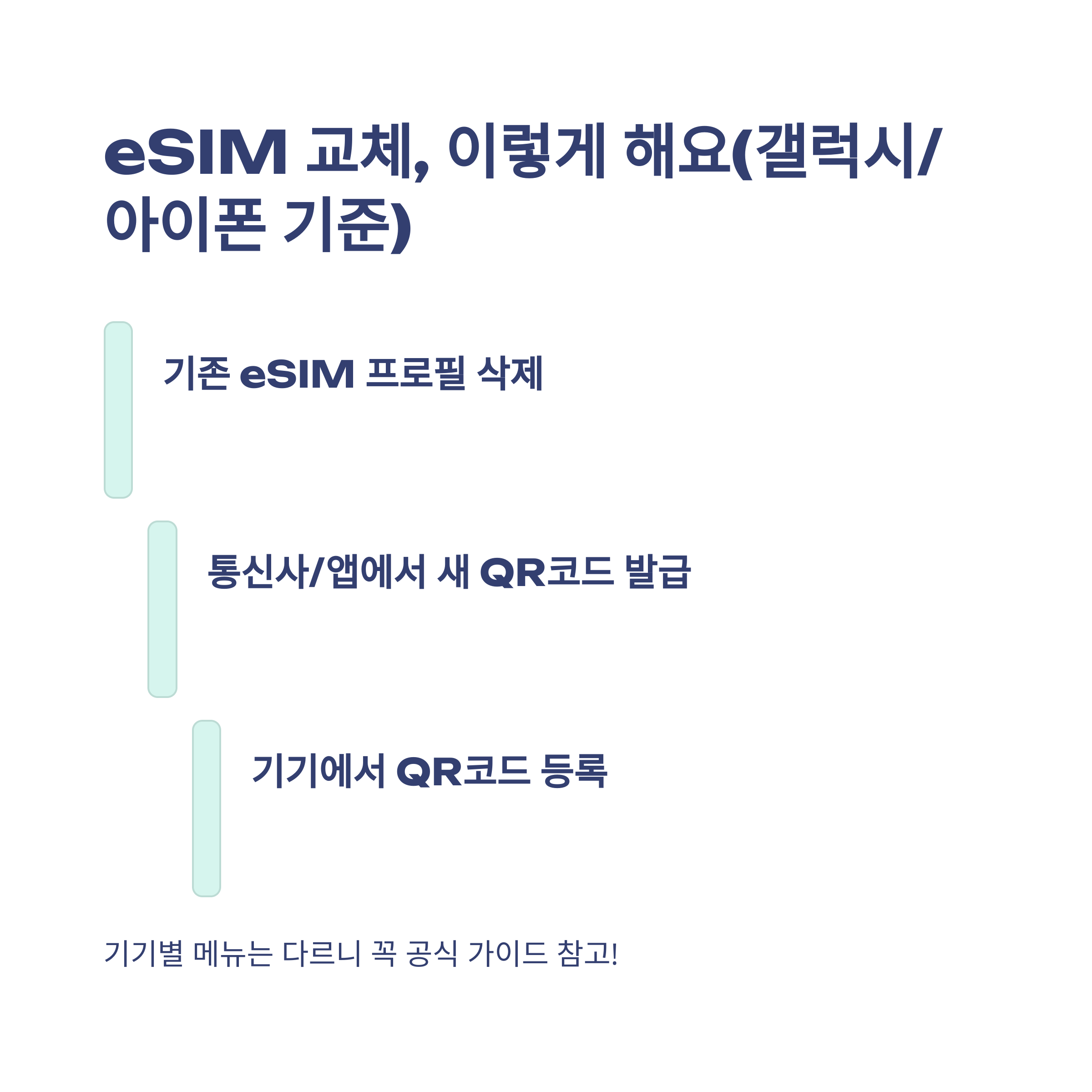- 갤럭시: 설정 > 연결 > SIM카드 관리 > 기존 eSIM 삭제 & 새 QR 등록