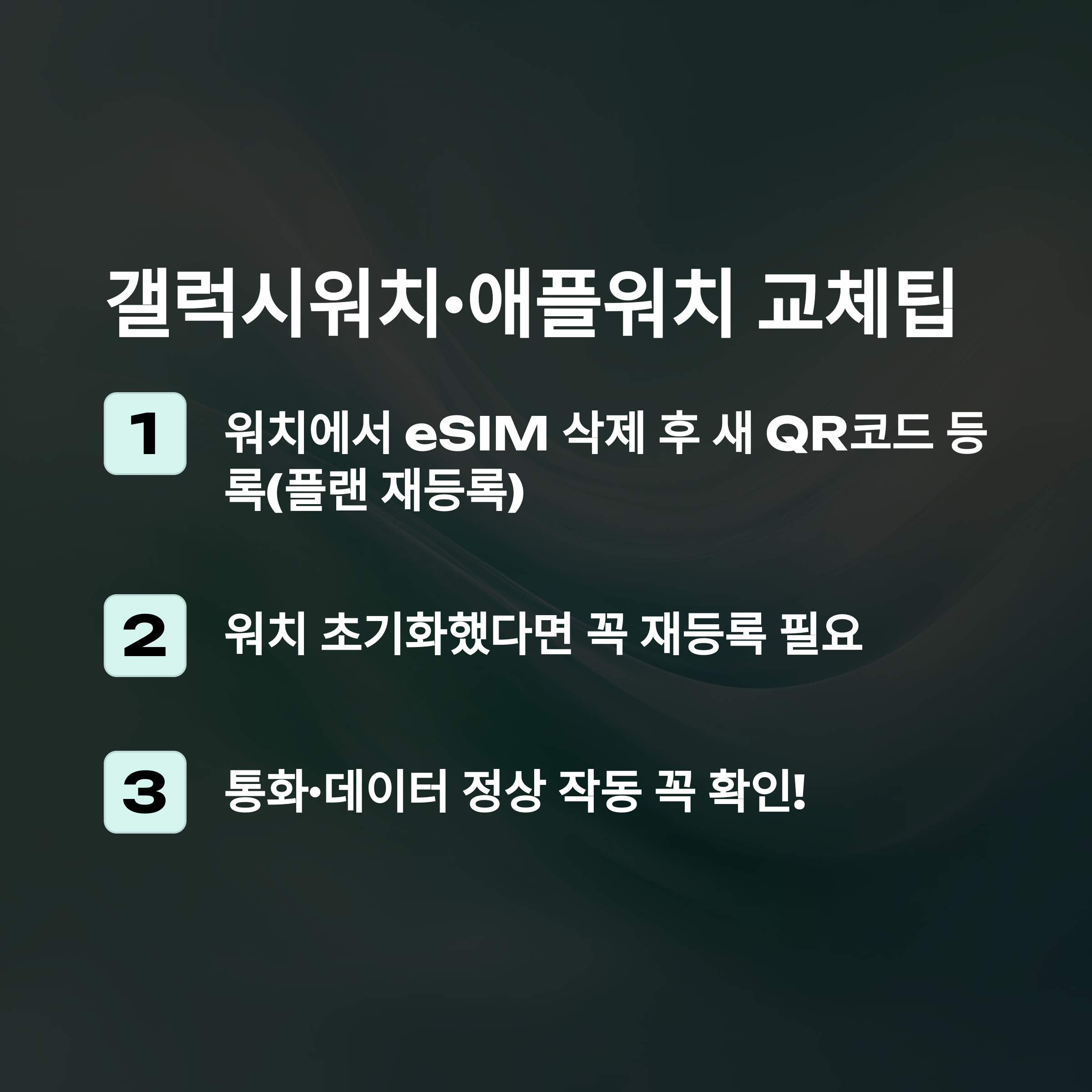 - 갤럭시워치: 삼성 Wearable 앱 → 모바일 플랜 → eSIM 삭제/재등록